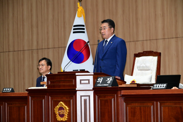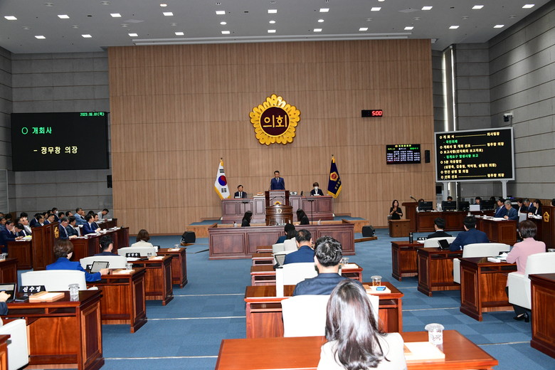 정무창 의장은 개회사를 통해 이번 회기에는 “광주시와 교육청의 2022회계연도 결산승인을 비롯한 일반안건들을 처리할 예정이며, 결산은 다음연도 예산편성과 심의의 토대가 된다는 점에서 ‘예산의 시작’이라고 할 만큼 중요하다며 집행부에서는 내년도 예산심의가 시작되었다는 심정으로 결산 심사에 임해주시길 부탁드린다”고 언급한 뒤, “어제(5.31.) 제28회 바다의 날을 맞아 우리의 먹거리인 바다가 일본 후쿠시마 원전 오염수 문제로 위기를 맞고 있다고 전하며, 우리 시의회도 지난 5월 임시회에서 ‘후쿠시마 원전 오염수 방류 규탄 결의안’을 처리한바 있으며,