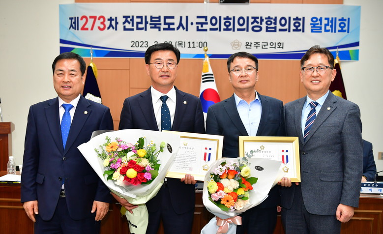 [완주=세계타임즈 = 김윤영 기자] 완주군의회 유의식, 김재천 의원이 23일 완주군의회에서 실시된 제273차 전라북도 시·군의회 의장협의회 월례회의에서 지방의정봉사상을 수상했다.