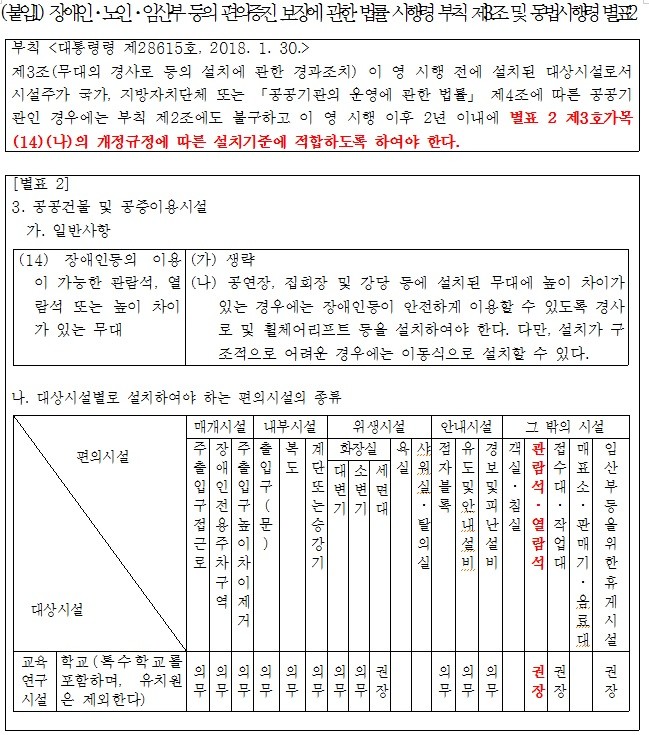 - 무대 높이차이 제거에 대한 장애인·노인·임산부 등의 편의증진 보장에 관한 법률 시행령 부칙 제3조와
