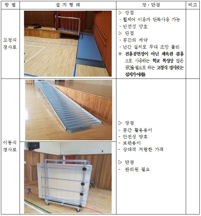 - 전용 공연장이 아닌 체육관 등으로 함께 사용되는 학교의 특성과 각 학교별 무대 높이, 설치 공간 등을 고려하여 고정식 리프트, 이동식 리프트·경사로 중 적절한 형태 설치 추진