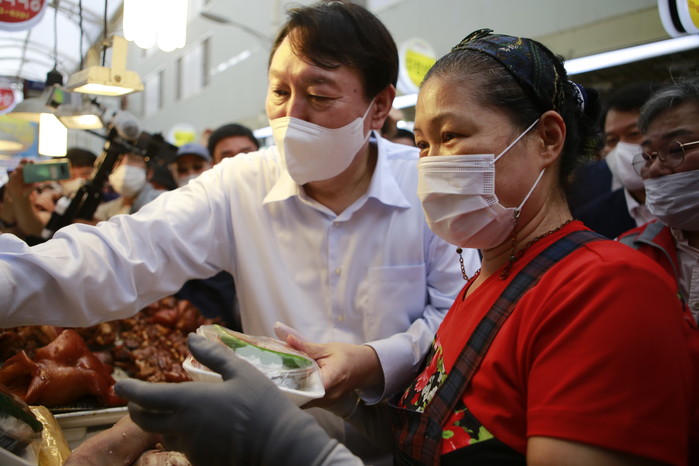 마산어시장 돼지족발골목 찾은 윤석열에 지지자들과 상인들 환호