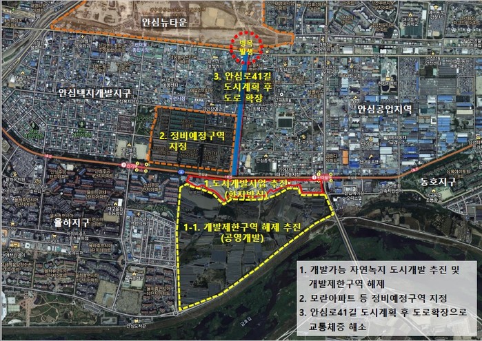 - 안심지역 도시철도 경유지 일원 자연녹지, 개발제한구역 공영개발 및 노후 시가지 정비사업 등 미니 신도시 조성 제안