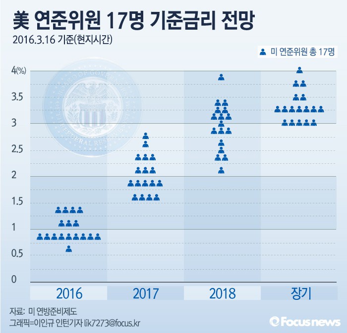 (서울=포커스뉴스) 점도표(Dop plot)는 미 연준의원 17명이 향후 기준금리 전망을 점으로 표시한 것이다.