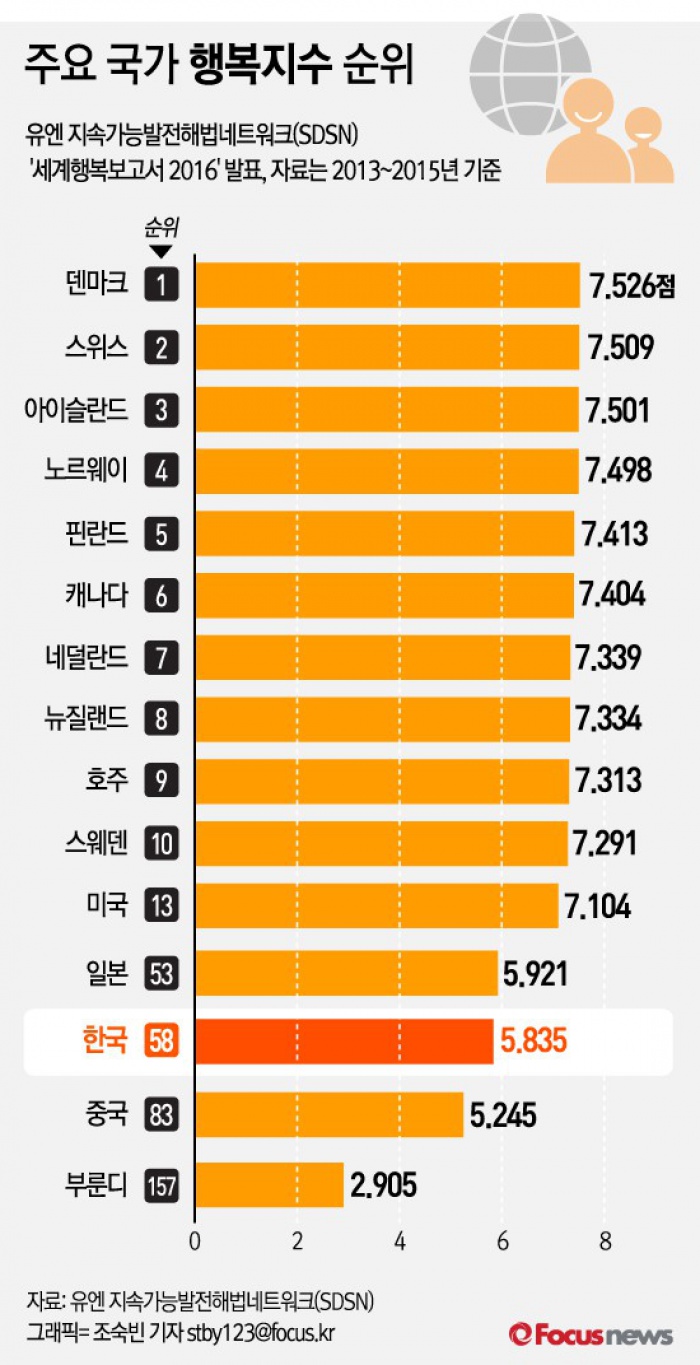 (서울=포커스뉴스) 16일 유엔 자문기구인 유엔 지속가능발전해법네트워크(SDSN)가 발표한 '세계행복보고서 2016’ 자료에 따르면 한국은 지난해 47위에서 11단계 하락한 58위를 기록했다.