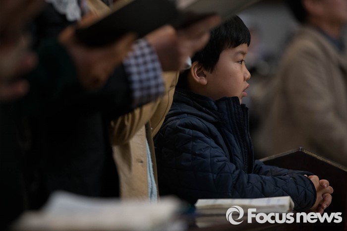 (서울=포커스뉴스) 부활절을 맞아 27일 정오 서울 중구 명동성당에서 열린 '예수 부활 대축일 미사'에 신도들이 참석해 기도하고 있다.