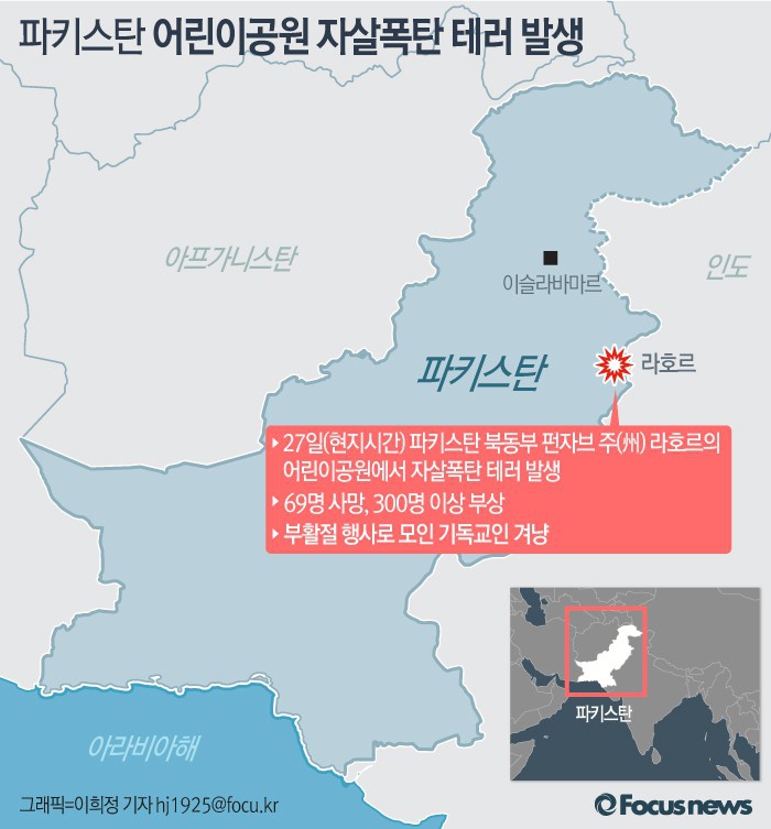 (서울=포커스뉴스) 27일(현지시간) 파키스탄 북동부 펀자브주의 라호르의 한 어린이 대공원에서 이슬람 극단조직의 자폭테러가 일어나 최소 65명 이상이 죽고 300여명이 다쳤다고 중국 관영 신화통신 등이 보도했다. 이번 사고는 부활절 행사로 모인 기독교인을 겨냥한 테러로 사고 피해자의 대부분은 어린이와 여성이다.