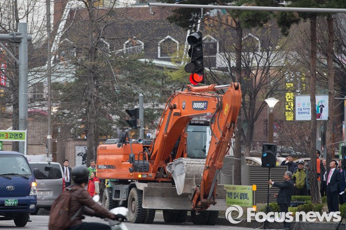 (서울=포커스뉴스) 6일 오후 서울 은평구 연신내 물빛공원에서 고연호 국민의당 은평구을 후보의 유세가 끝나고 철수하던 포크레인이 신호등을 건드려 망가졌다.