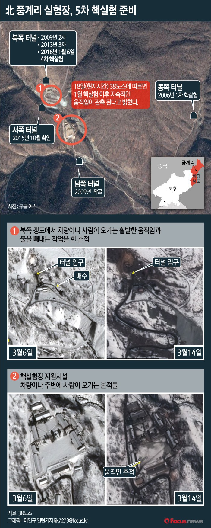 38노스의 잭 리우는 상업용 위성사진을 통해 함경북도 길주에 있는 풍계리 핵실험장의 움직임을 분석했다.