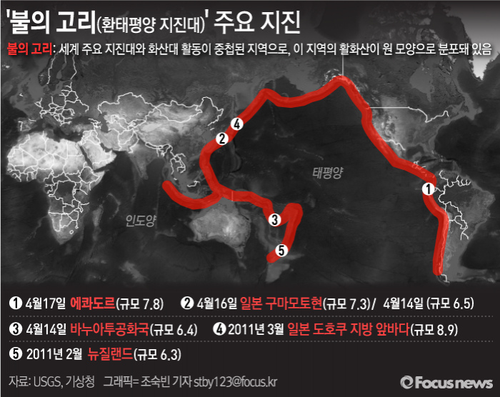(서울=포커스뉴스) 이른바 '불의 고리'로 불리는 환태평양 지진대에 위치한 나라들에서 연달아 강진이 발생하고 있다.