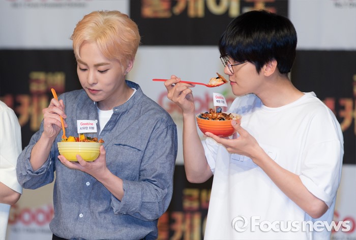 (서울=포커스뉴스) 29일 오후 서울 강남구 일지아트홀에서 열린 '굽네 볼케이노와 함께하는 엑소(EXO) 치밥 쿠킹 팬사인회'에서 시우민(왼쪽)과 백현이 포즈를 취하고 있다.