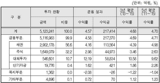 2015년도말 국민연금기금은 512조3241억원으로, 2015년도 기금의 총수익률은 4.57%(금액가중수익률 기준), 수익금은 21조7414억원이었다.