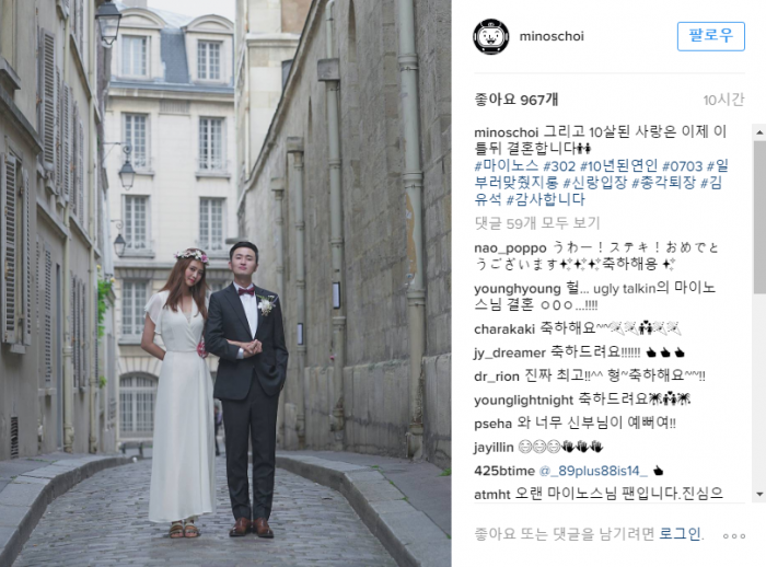 마이노스는 30일 자신의 인스타그램 계정에 웨딩사진을 공개하며 오는 3일 결혼 소식을 알렸다. 마이노스와 예비신부는 10년 간 연애한 끝에 결실을 맺은 것으로 알려져 화제를 모았다. 이미 힙합계에서는 유명한 장수커플로 알려져 있었다는 것이 관계자들의 전언이다.