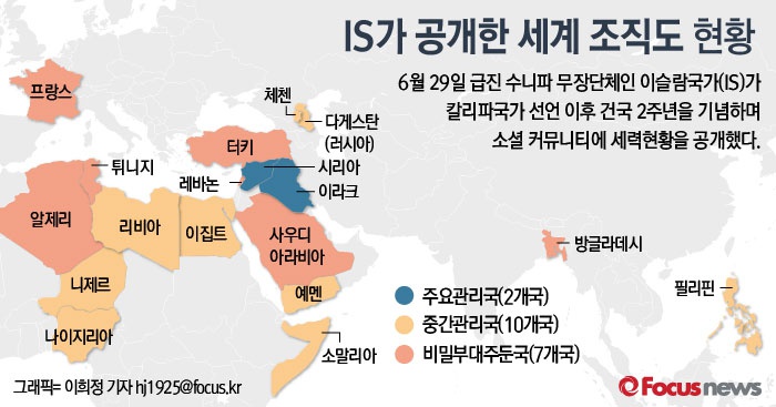 IS는 지난달 29일 아마크통신을 통해 '2014년 6월 29일 칼리파 국가 선언 이후 2년간 IS의 확장'이란 제목의 조직도를 발표했다. 실질적 본부 역할을 하는 시리아와 이라크 등 세계 19개국의 본부와 지부, 비밀 조직의 존재를 공개했다.