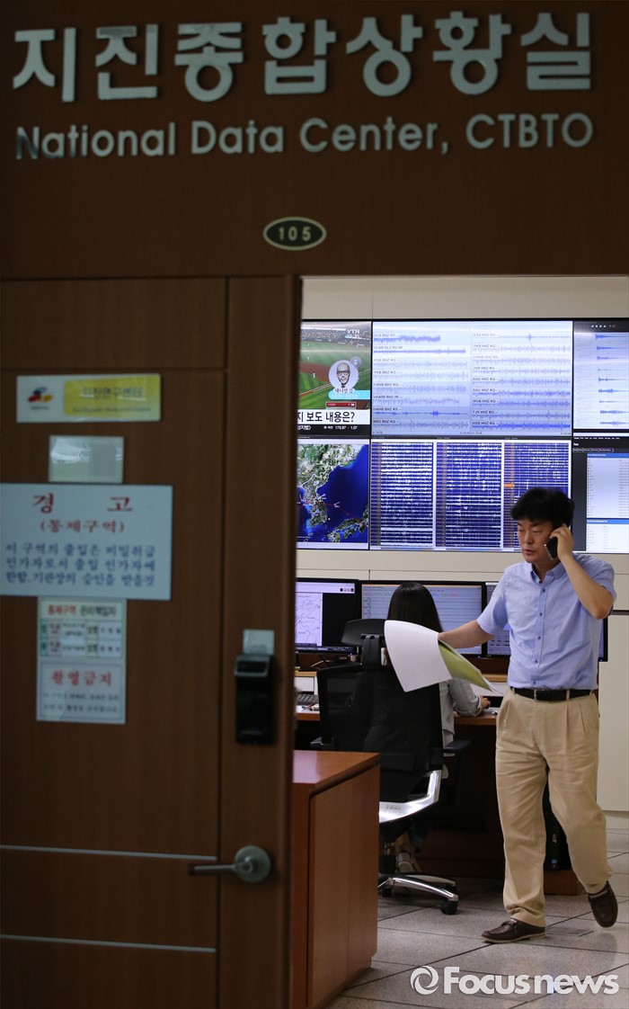 (대전=포커스뉴스) 6일 오전 대전 유성구 한국지질자원연구원 지진연구센터에서 직원들이 지진상황을 모니터 하며 분주한 모습을 보이고 있다. 지난 5일 오후 8시 33분께 울산 동구 동쪽 52㎞ 해상에서 규모 5.0의 지진이 발생했다.