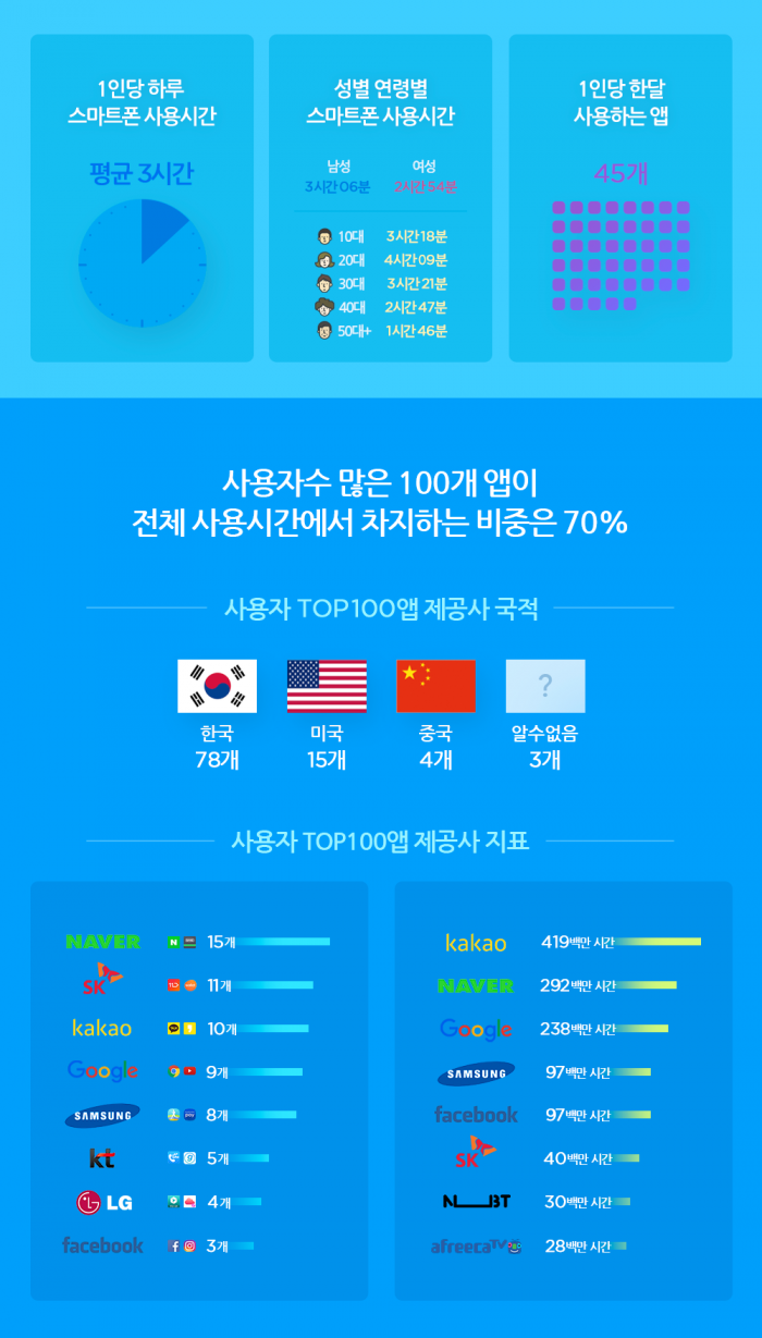 모바일 시장조사 업체 와이즈앱이 발표한 6월 국내 안드로이드 스마트폰 사용조사 결과에 따르면 우리 국민은 하루 평균 3시간씩 스마트폰을 이용했으며 1인당 한달 평균 사용하는 앱은 45개였다. 특히 사용자가 많은 100개 앱이 국민 총 사용시간에서 차지하는 비중은 70%였으며 국적은 한국이 78개, 미국이 15개, 중국이 4개였다.