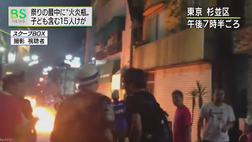 NHK 등 복수 매체는 7일 밤 축제가 진행되던 일본의 도쿄 스기나미구의 상가 근처에 화염병으로 추정되는 물체가 떨어져, 6세 소녀를 비롯해 총 15명이 화상을 입었다고 8일 보도했다. 중상자는 없는 것으로 확인됐다.