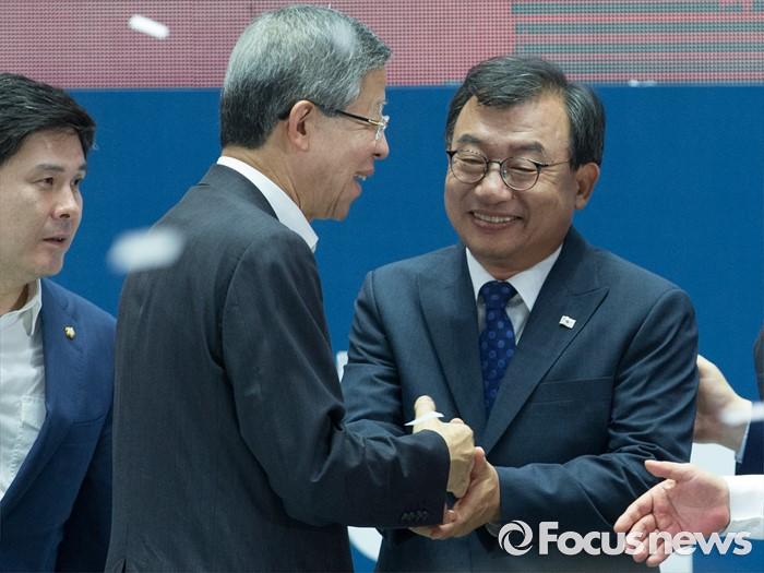 (서울=포커스뉴스) 9일 오후 서울 송파구 잠실실내체육관에서 열린 새누리당 4차 전당대회에서 신임 당대표로 선출된 이정현(오른쪽) 의원과 김희옥 혁신비대위원장이 악수하고 있다.