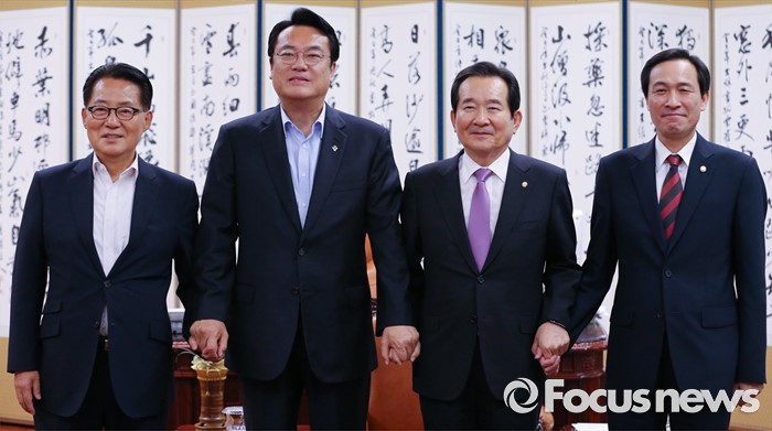 | △ 손 잡은 정세균 국회의장과 3당 원내대표 |